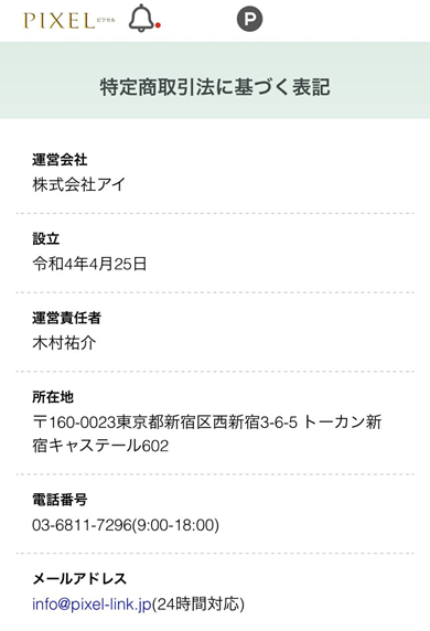 PIXEL(ピクセル)の特定商取引法に基づく表記