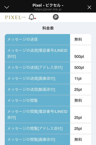 PIXEL(ピクセル)を実際に使いましたが、まずメッセージが隠れておりそれを開くにはポイントが必要になります。メッセージを送るのも有料です。