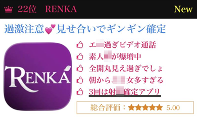 RENKAの口コミですが圧倒的に星5の最高評価のコメントばかりが多く投稿されています。ただビデオ通話アプリの口コミとしては見慣れた光景であり、恐らくは自作自演かと思われます。