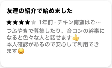 同じ企業が運営しているだろうMIYABI(ミヤビ)というビデオ通話アプリの口コミでは、1年前に出来もしない「呟きで合コンの募集をして幹事をしている」と投稿しておりました。