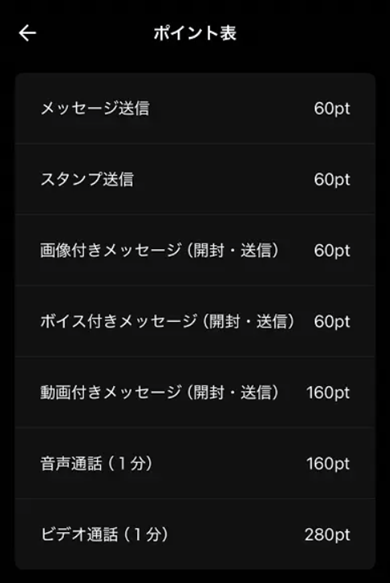 | メッセージ送信 | 60ポイント(75円)/通 |