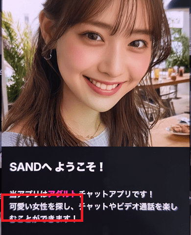 また可愛い女性を探しと赤枠で囲っている部分があるように「SAND(サンド)は男性だけが新規登録する事が前提で作られて」います。普通のマッチングアプリのように一般人女性は登録しておりません。