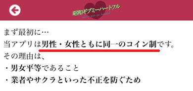 この画像は昭和ギブミーハートフルに登録したら最初に届いた運営からの案内メッセージでした。そして男女平等というコンセプトと業者やサクラを防ぐために女性も男性と一緒の料金が掛かってくるとのことでした。