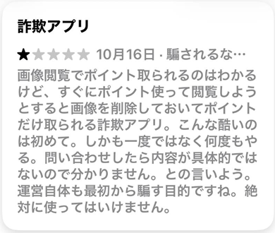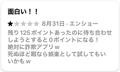 誘惑的なアプローチから連絡先の交換の禁止。最初の無料ポイントの配布から待ち合わせまでが王道とも言える手口となっています。誰が利用しても同じような体験をしますのでご注意下さい。