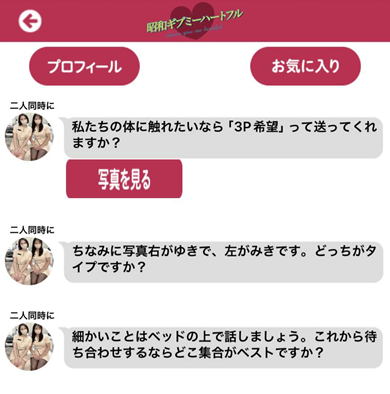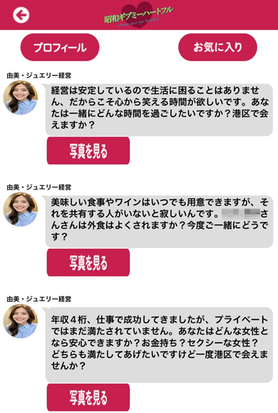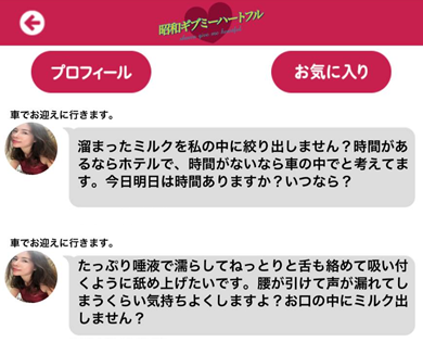 昭和ギブミーハートフルは昭和世代が楽しむマッチングアプリとしてリリースされたように見えます。しかし本当の狙いはこういった露骨な広告を掲載する事によりすぐに会いたいと男性に思わせ、早い展開で待ち合わせ場所に引っ張りだし会話を引き延ばし課金させる事となっています。