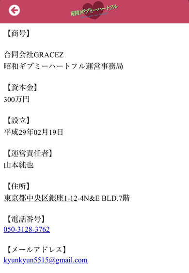 昭和ギブミーハートフルは合同会社GRACEZという企業が運営しています。法人登記されているので実在はするような情報となっています。ただし安心はしないで下さい。