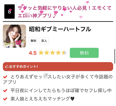 料金も非常に高いし、まず会えないので昭和ギブミーハートフルは使わないようにして下さい。ヤリモクやセフレなど体の関係狙いであれば下ですぐ紹介しているサービスがオススメです。
